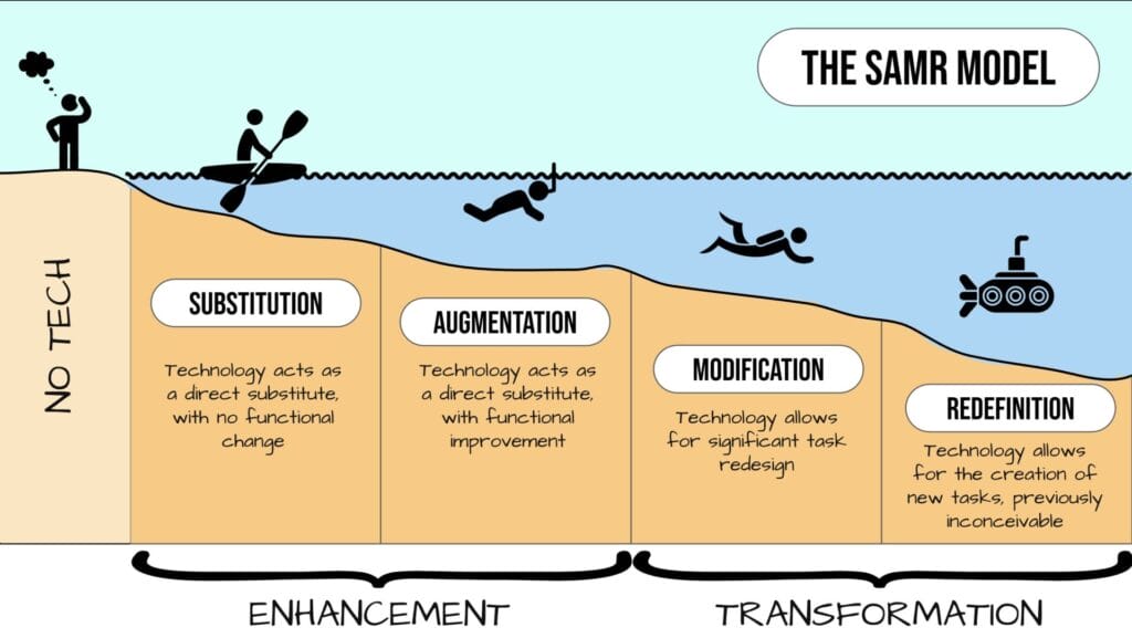 A simple way to think about this is through the SAMR Model, developed by former Harvard teaching fellow Dr. Ruben Puentedura. At its core, it asks: Does the technology change the task? And it neatly spells out four distinct tiers of possibilities that can unfold in our lessons as a result of tech integration.